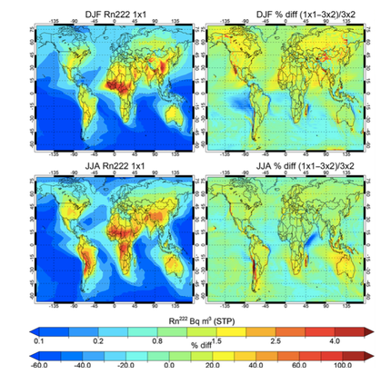 Figure 1. The seasonal distributions of 222Rn averaged between 800 and 900 hPa for DJF (top) and JJA (bottom) for the 3o × 2o (left) and 1o × 1o (right) simulations, with the associated percentage differences when compared against the 3o × 2o simulation.