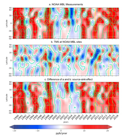 Figure 2. The latitudinal dependence of the CH4 growth rate (referred as zonal growth rates in the main) derived using (a) the NOAA method applied to MBL measurements, (b) the TM5 transport-only simulation, and (c) the difference of (a) minus (b). Red colors indicate positive growth rates; blue colors represent negative growth rates. The green numbered growth rate contours are in ppb/year. The yellow vertical lines mark the beginning and end of three periods discussed in the main text: (i) El Niño of 1998, (ii) La Niña of 2010, and (iii) 2014. NOAA = National Oceanic and Atmospheric Administration; MBL = marine boundary layer.