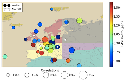 Figure 6. Performance of inversion M3 (see paper for definition) at European in-situ observation sites, whose data were assimilated in the model, and at the location of four aircraft campaigns. The campaign locations are marked with stars. Aircraft observations were used for validation. The colour of the marker for the in-situ observation site is determined by the RMSE of the observations and posterior mole fractions divided by the pre- defined mdm. The radius of each circle provides the correlation between observations and posterior mole fractions, where a larger radius corresponds to a smaller correlation. Background colours identify the mTC regions (see paper for further details)