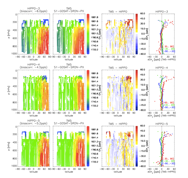 This picture is taken from Alexe et al. (2014). Simulation S1-GOSAT-SRON-PX (TM5 with assimilated GOSAT (GOSAT-PX) and NOAA surface data) is validated against HIPPO campaigns 3–5 (south-bound and northbound flights). Rightmost panels show the average bias as a function of latitude: extra-tropical Northern Hemisphere (NH) in red, extra-tropical SH in blue, and the tropics in green.