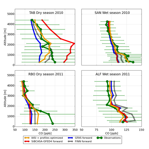 This paper discusses the impact of the 2010 drought on the carbon balance of the Amazon. Fire emissions are obtained from various biomass burning inventories: GFAS, FINN, and SibCasa-GFED4. Moreover, emissions are optimized by assimilating IASI observations and aircraft CO profiles. The figure compares various profile observations to simulations that employ the various emission estimates. Bars on the green lines denote variability in the observations.