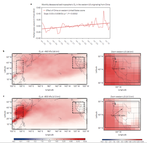 Figure 3: The effect of Chinese emissions and long-range transport on tropospheric O3 over the western US. a, Monthly deseasonalized di erence between the global TM5 run with observationally constrained 2005–2010 anthropogenic NOx emissions and the TM5 run with constant 2005 NOX emissions for China and observationally constrained emissions everywhere else. b, Difference in O3 in the free troposphere (∼460 hPa) between the two TM5 runs for April–May 2010 sampled at the Aura overpass time. c, As for b but showing the lower troposphere (∼800 hPa). See paper for details.