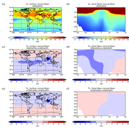 Figure 1: Simulated annual mean surface (a, c, e) and zonal mean (b, d, f) O3 mixing ratios (ppb) for the MOGUNTIA chemistry scheme for the year 2006 (a, b) and the respective differences compared to mCB05(KPP) (c, d); the surface and zonal mean absolute differences between mCB05(KPP) and mCB05(EBI) are also presented (e, f).
